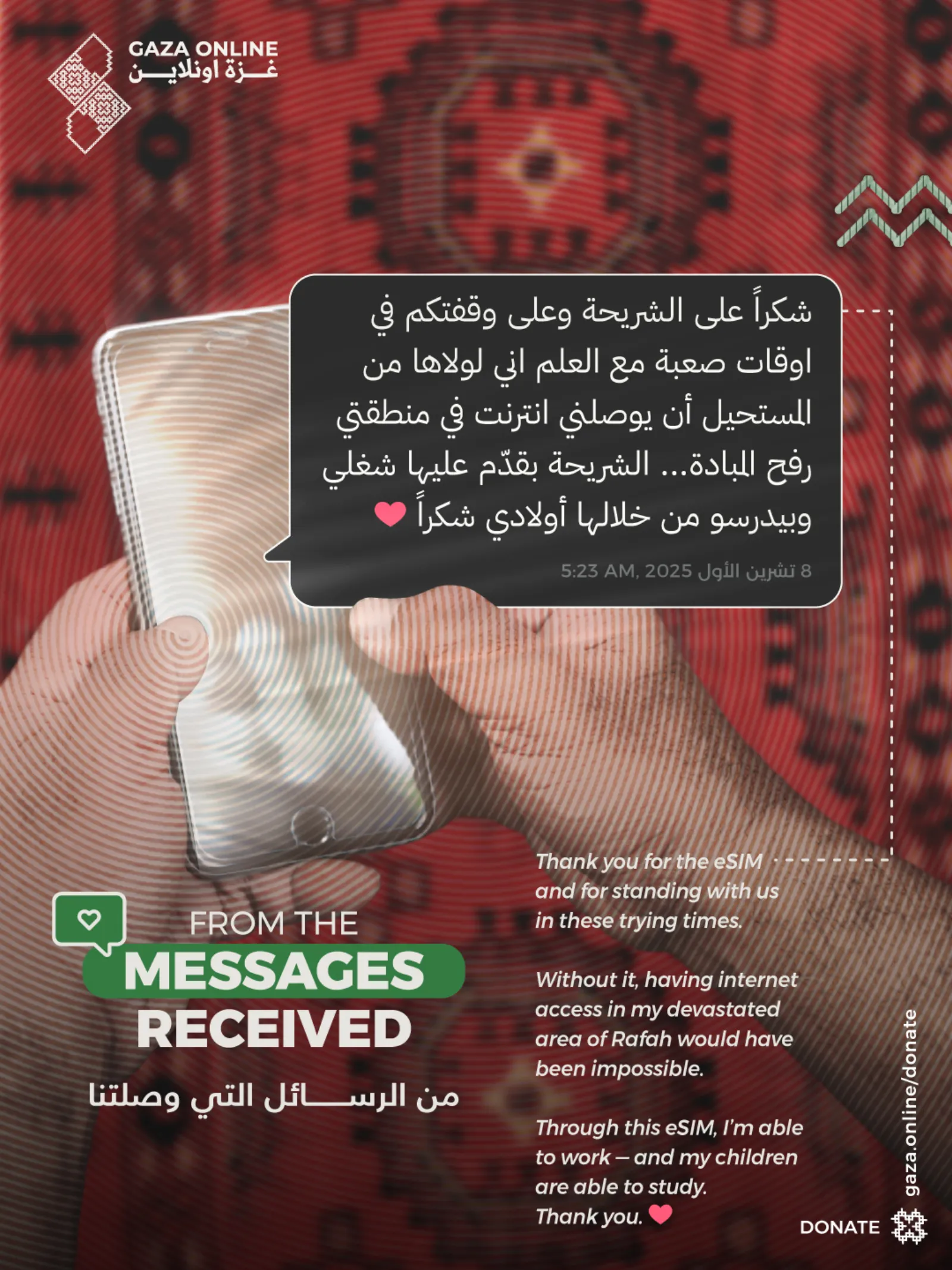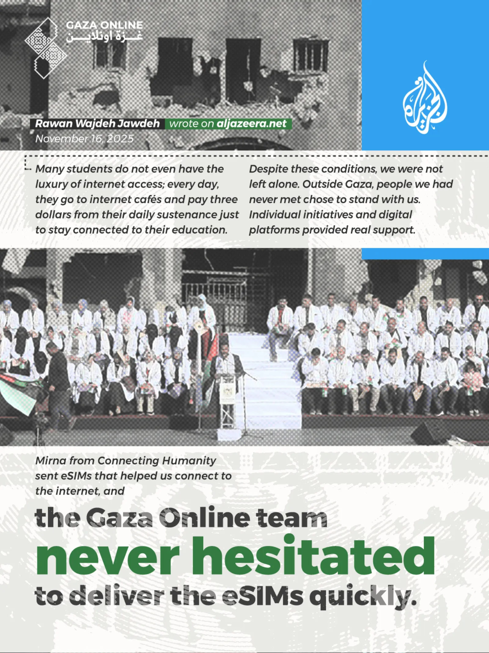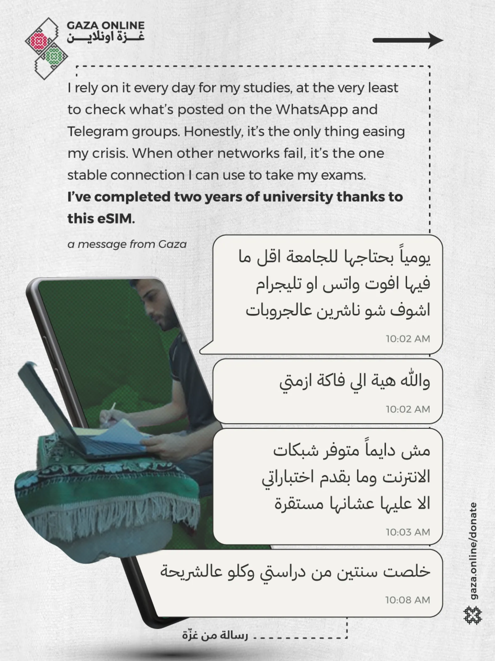 In Gaza, connectivity is essential to safety, opportunity, and dignity. Whether it’s learning, medical coordination, journalism, remote work, or staying in touch with loved ones, Gaza Online provides a resilient digital lifeline — built to connect, enable, and sustain communities when it matters most.